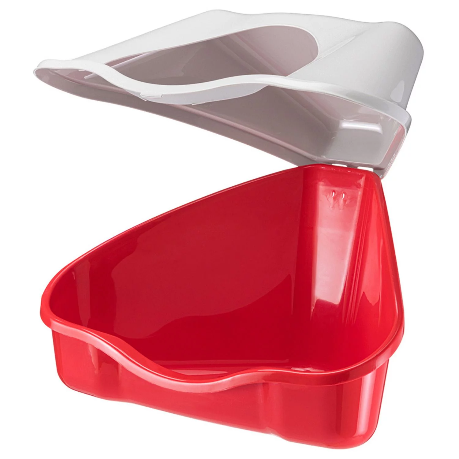 Het knaagdiertoilet Nora 3c heeft een afmeting van 50x34x22 cm en is verkrijgbaar in 3 kleuren. De onderbak is rood, grijs of zwart met een witte cover.