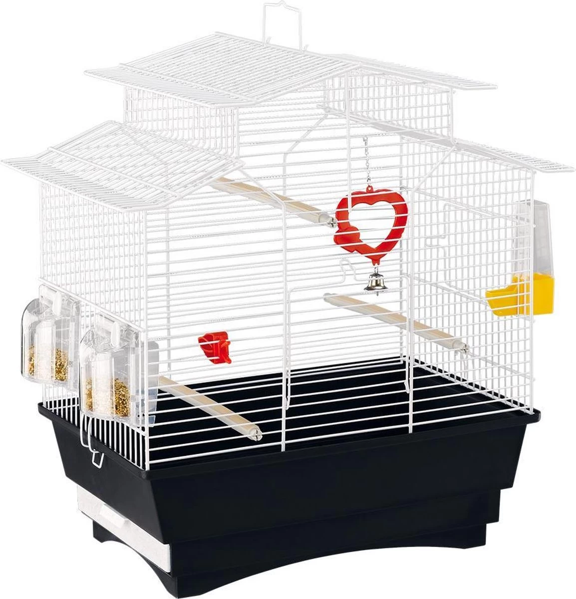 Pagoda is een kleine vogelkooi, ideaal voor kanaries, exotische vogels en andere vogels. Het beschikt over een ongewoon gevormd dak dat meerdere niveaus heeft, een grote ruimte en meer bewegingsvrijheid voor uw vogels. De kunststof voet heeft ook een originele vorm, lijkt op stappen, en wordt geleverd met een verwijderbare vuilopvangbak om schoonmaken mogelijk te maken. Pagoda is een rechthoekige vogelkooi, uitgerust met accessoires, waaronder een plastic drinkfles en comfortabele met rubber beklede zitstokken, een voedselklem, een speelgoed met spiegel en bellen en Brava 1 draaiventilators. Pagoda is ook verkrijgbaar in een met messing beklede draadgaasversie. Een plastic standaard is beschikbaar als een optie voor beide versies.